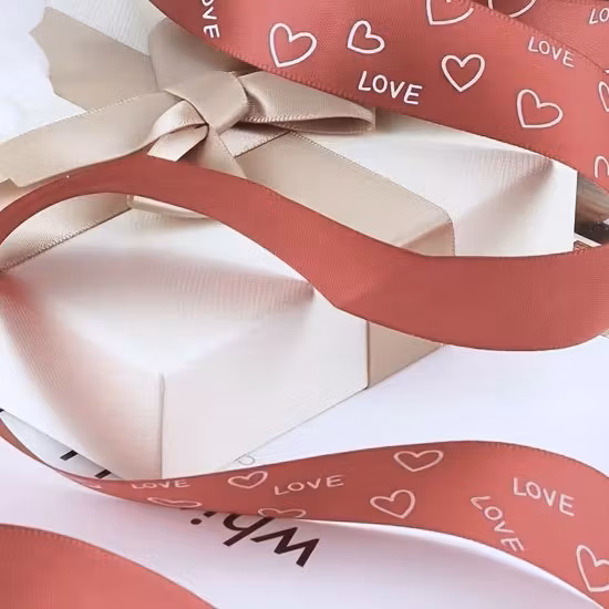 Satinband med texten Love och hjärtan i en djup röd färg. Perfekt för Alla hjärtans dag, DIY-rosetter, presentinslagning & bukettdekoration . Mjukt hjä