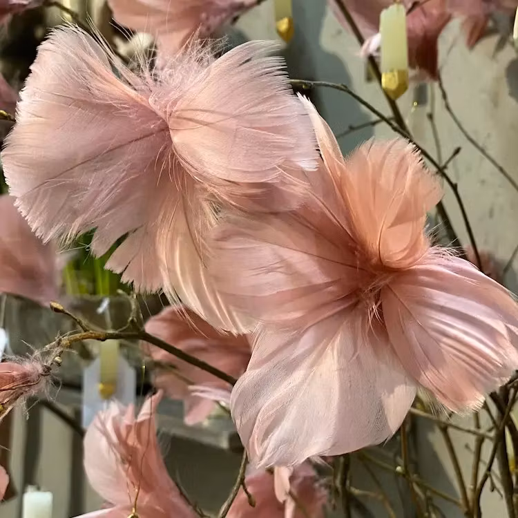 Våra fjäderblommor i gammelrosa ger ett mjukt, romantiskt och dekorativt uttryck i hemmet. De är enkla att fästa i björkris, på kvistar eller använda i blomsterarrangemang, kransar och buketter. Perfekta som påskfjädrar eller som ett blomliknande inslag i vårens dekorationer.