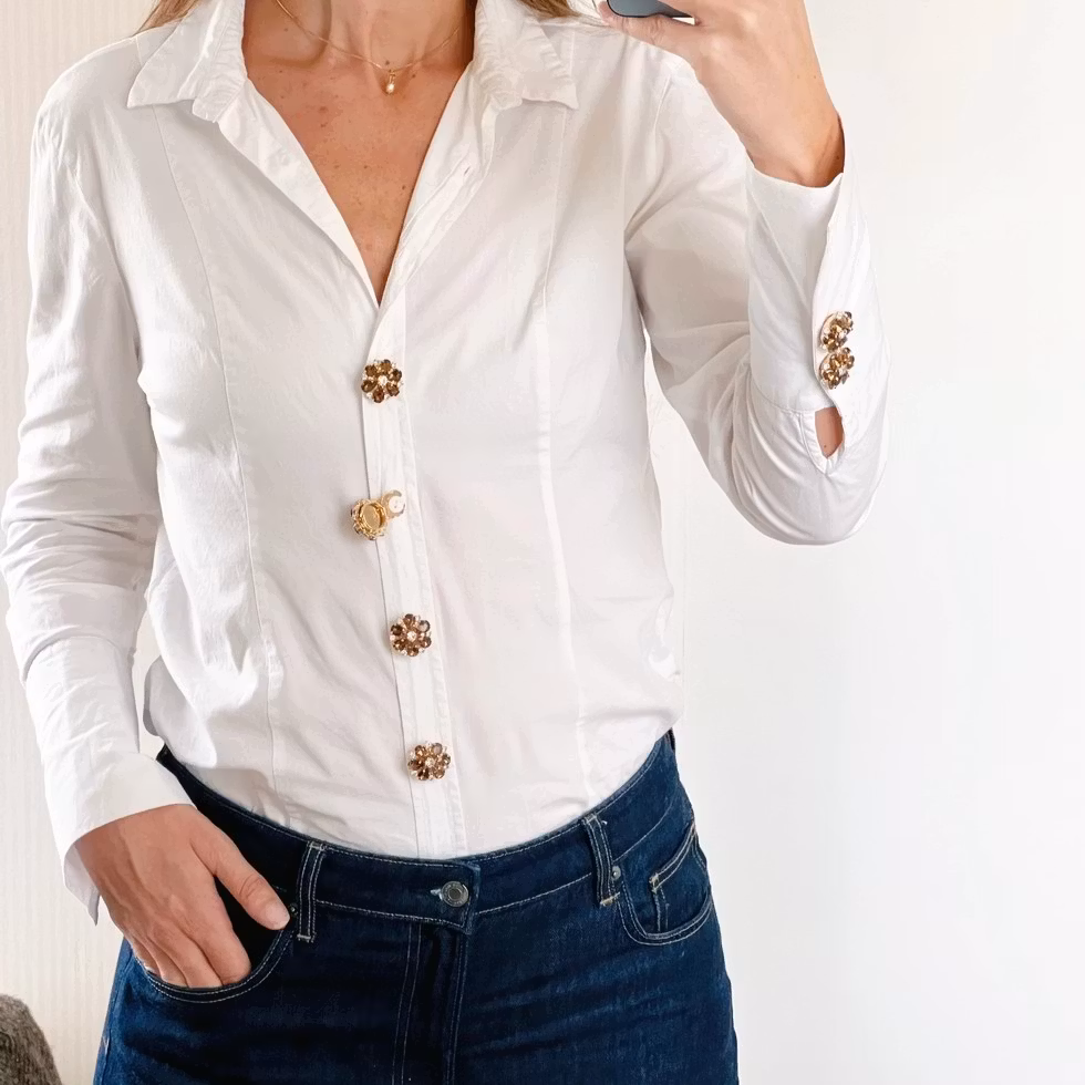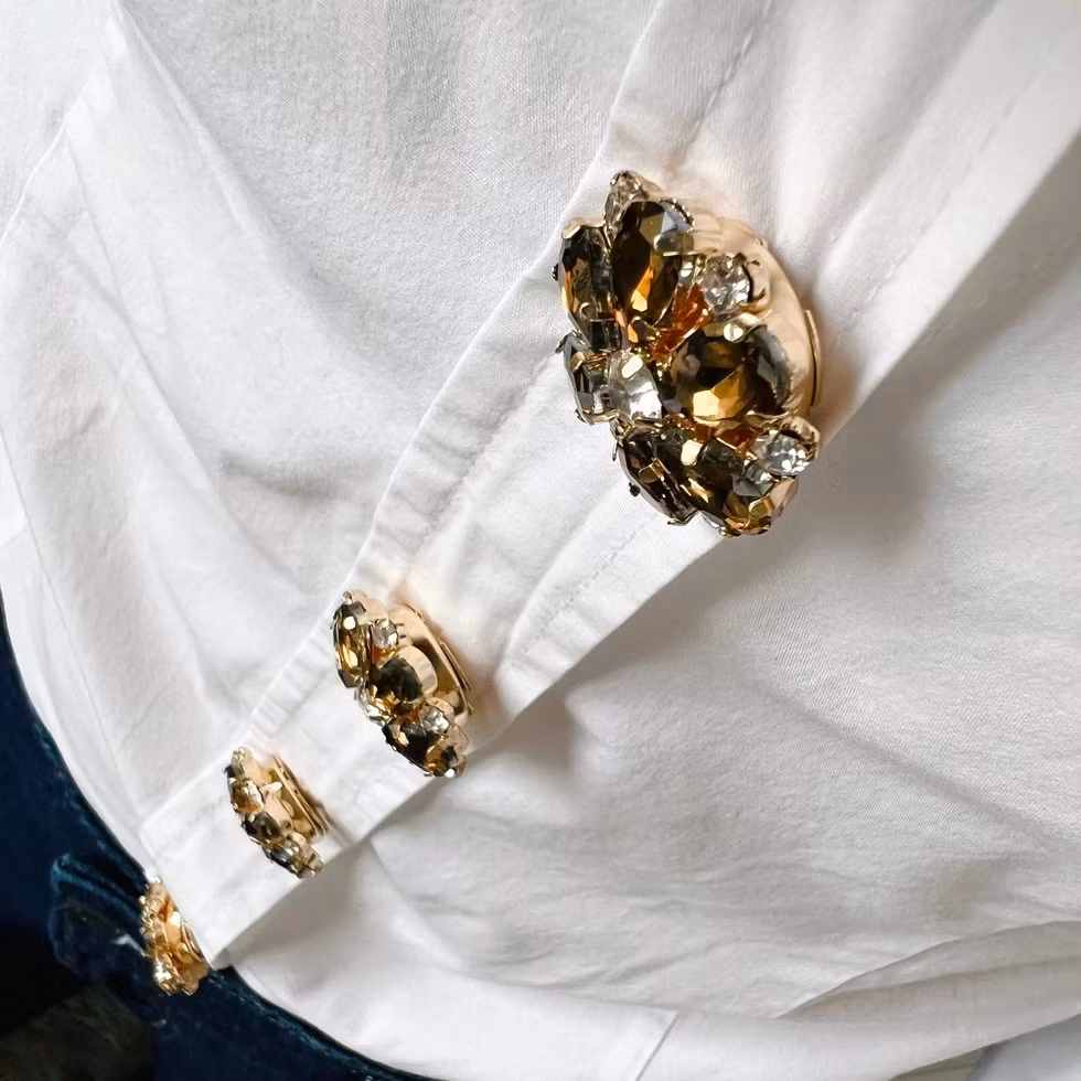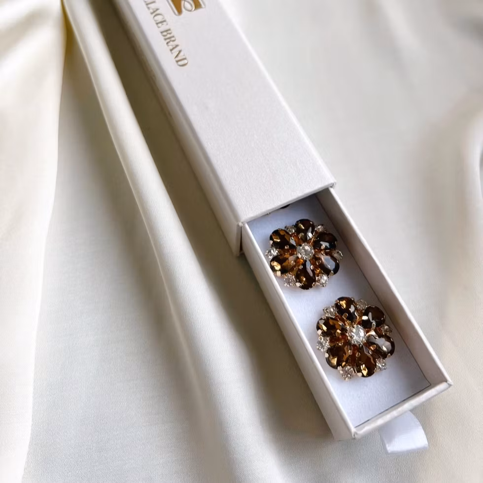 Ett feminint knappsmycke med mjuk brun bas och sex elfenbensvita pärlblad, vackert kantade i guld. Ett gnistrande kristallcentrum ger smycket ett varmt och elegant uttryck med en tidlös känsla.