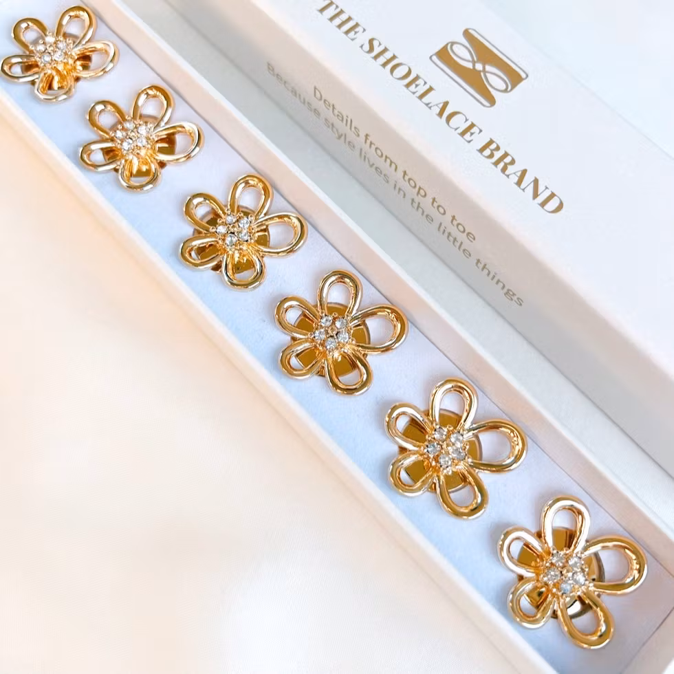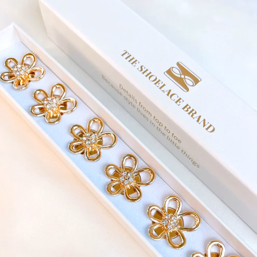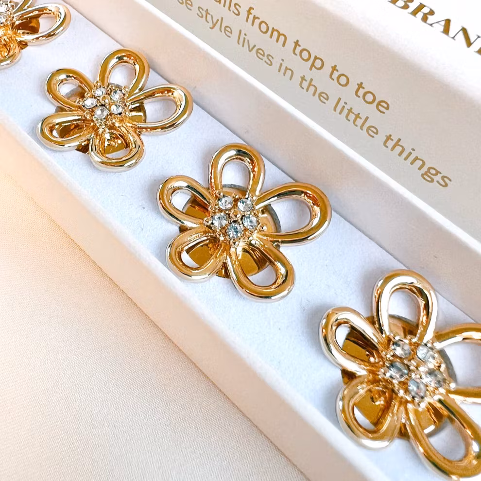 Ett strålande knappsmycke i öppen blomdesign med polerade guldfärgade kronblad. I mitten sitter gnistrande kristalldetaljer som ger smycket ett elegant och livfullt uttryck. Raffinerad!