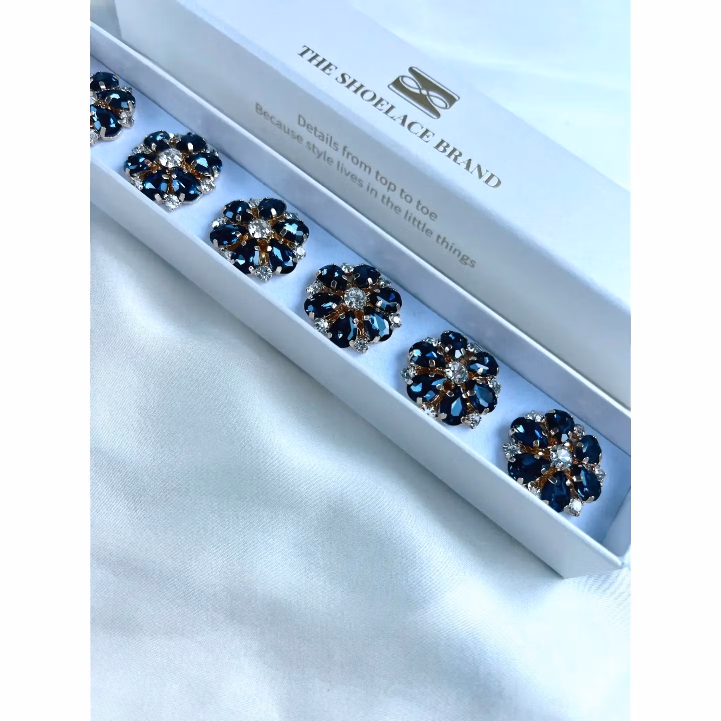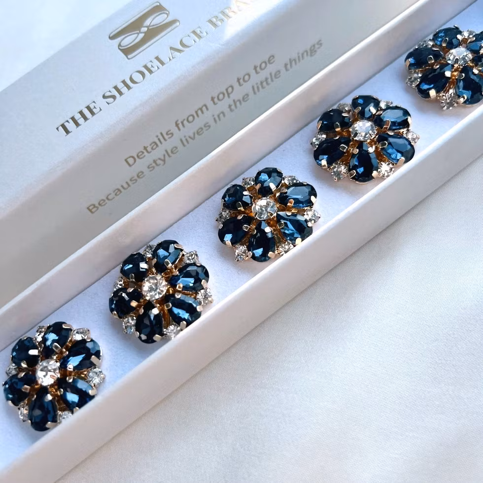 Ett elegant knappsmycke i blomform med marinblå och vita kristallblad. De facetterade kristallerna skapar ett vackert djup och sitter på en polerad guldfärgad bas som ger smycket ett tidlöst och förfinat uttryck. Elegant!