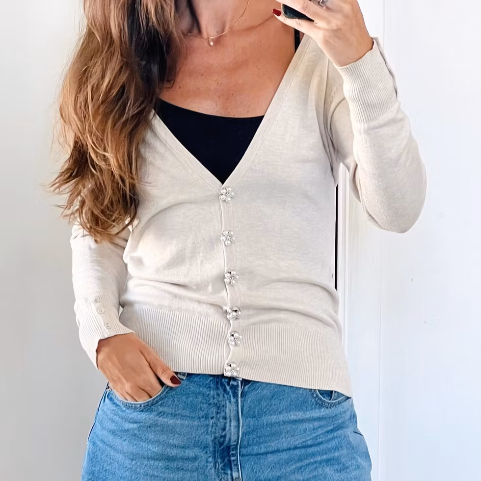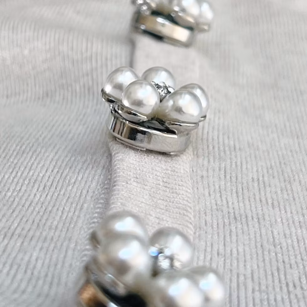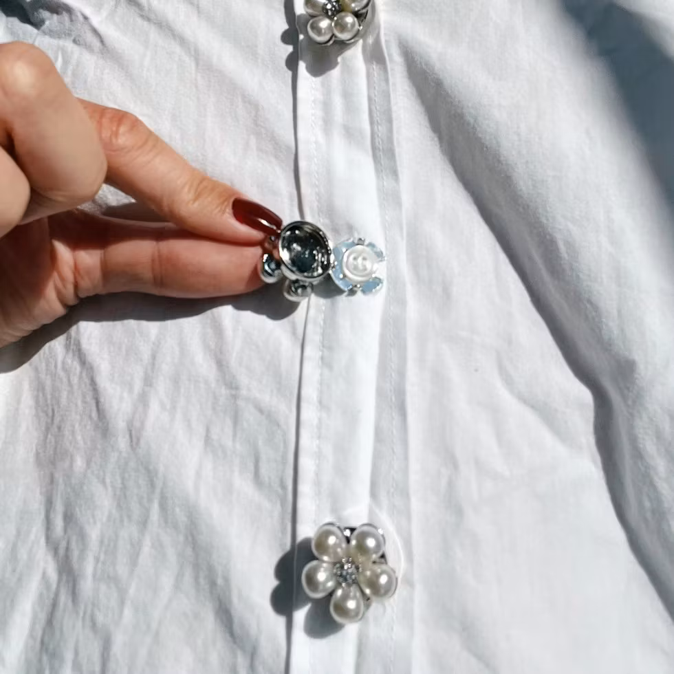Ett elegant knappsmycke i blomform med mjuka vita pärlblad och en gnistrande kristall i mitten. Bas i silverton som ger ett ljust, tidlöst uttryck och lyfter blusar, skjortor och koftor med en subtil smyckeskänsla.