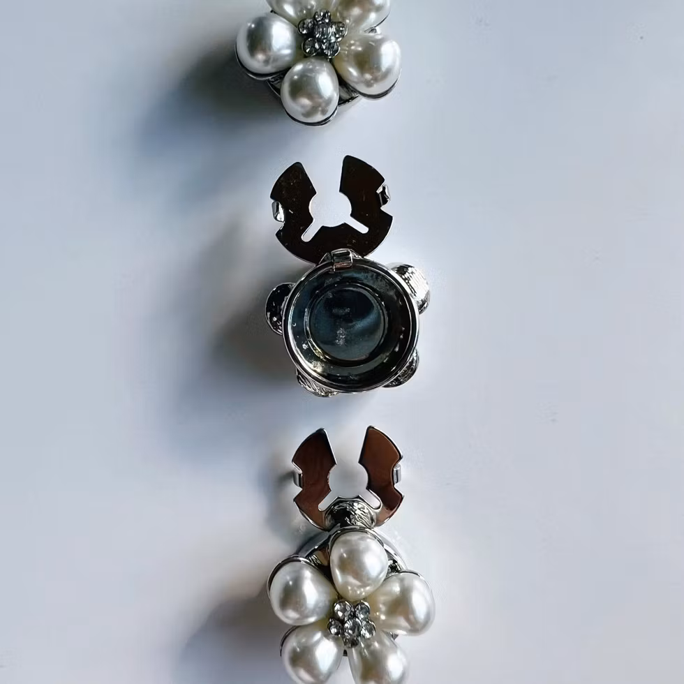 Knappsmycke Rosi med vita pärlblad och kristall i mitten. Klickas på standardknapp och ger plagget en ljus, tidlös elegans