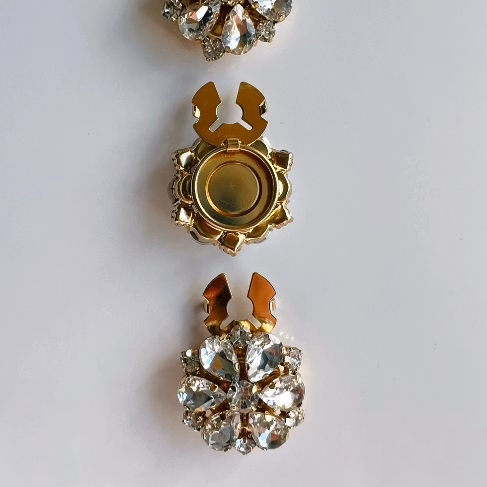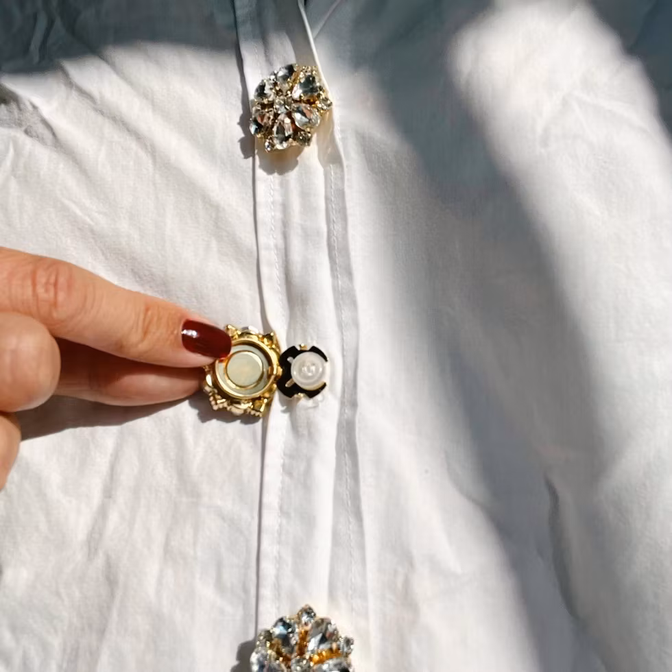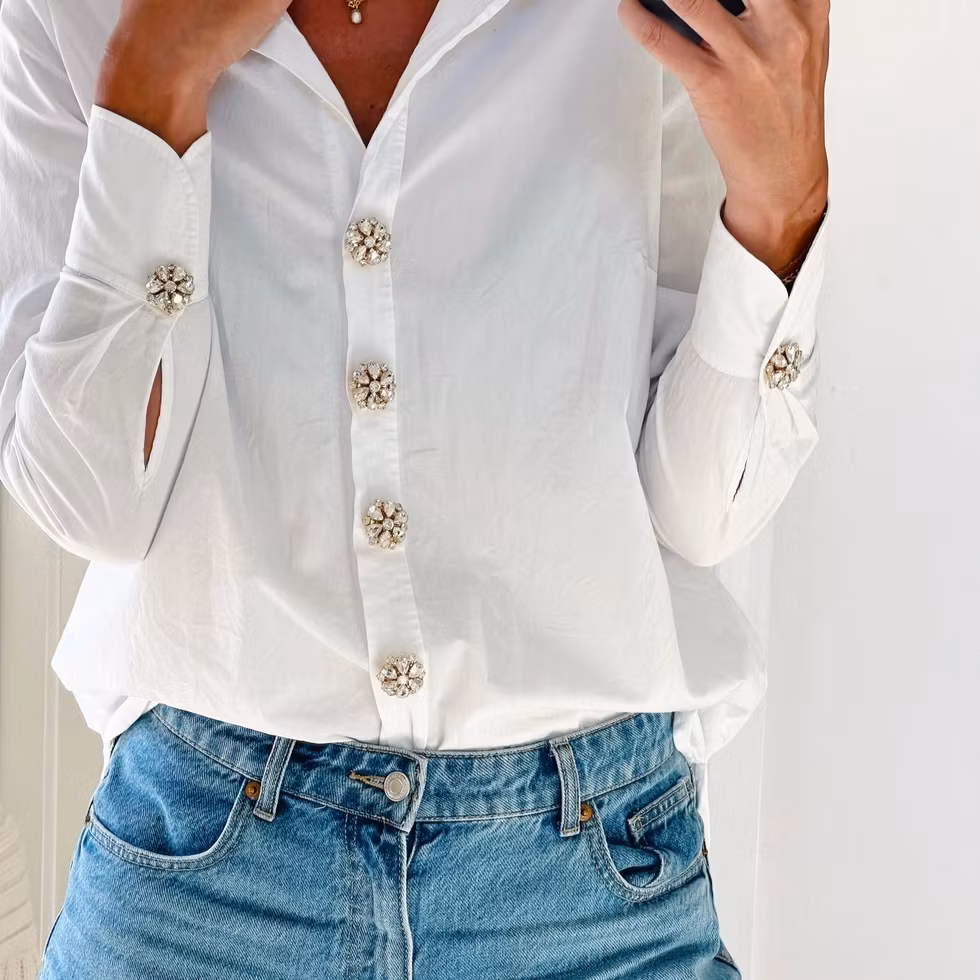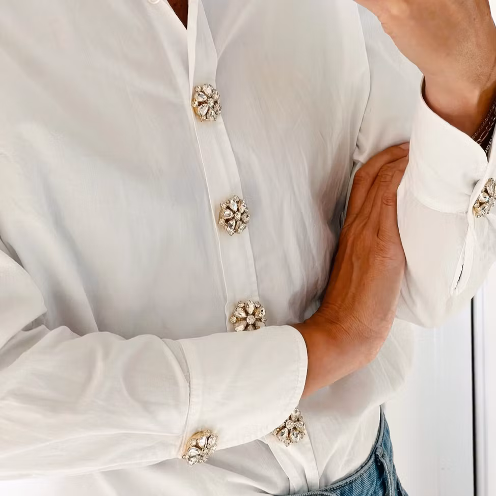 Knappsmycke Signe med vita stenar och kristaller i blomform. Klickas på standardknapp och ger blusar och skjortor en ljus, elegant känsla.