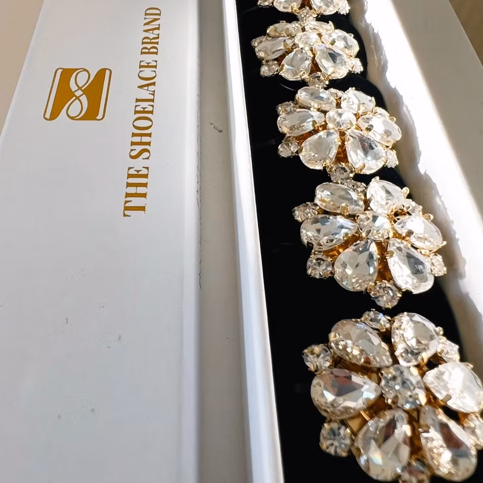 Ett blomformat knappsmycke med sex tårformade vita stenar som kronblad. Små klara kristaller mellan stenarna och en skimrande mittsten skapar ett elegant, balanserat uttryck. Guldfärgad bas för en varm och tidlös helhet.