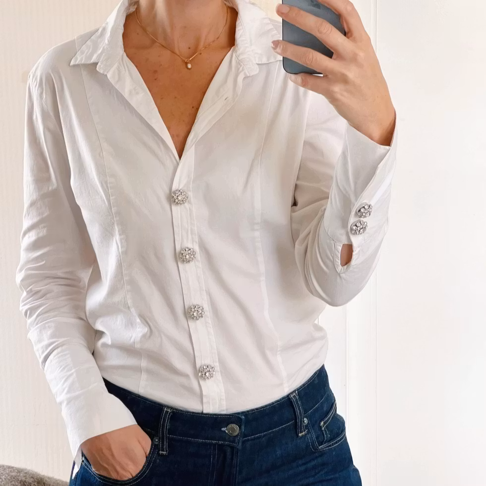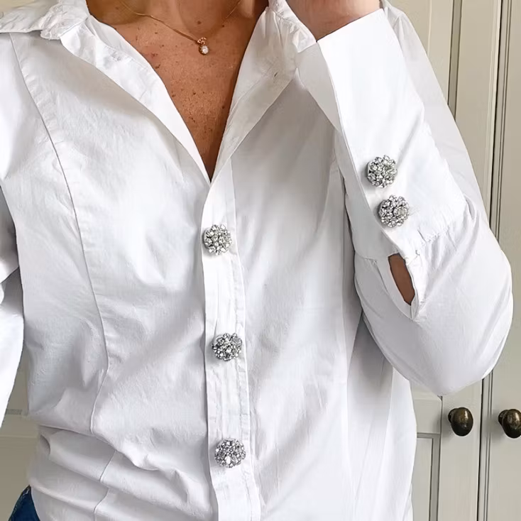 Ett ljust och elegant knappsmycke med rund, fasetterad kristalltopp som fångar ljuset vid varje rörelse. Den polerade basen i silverton skapar en mjuk klustereffekt med ett raffinerat och tidlöst uttryck.