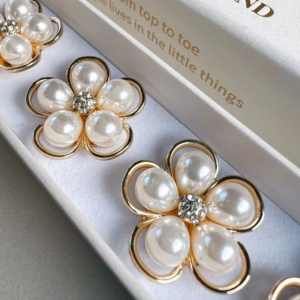 Ett elegant knappsmycke med blomformade pärlemorskimrande kronblad. De mjuka bladen ramas in av en polerad guldfärgad kant och i mitten sitter små kristalldetaljer som ger ett diskret och vackert skimmer. Varm, elegant och mjukt lysande.