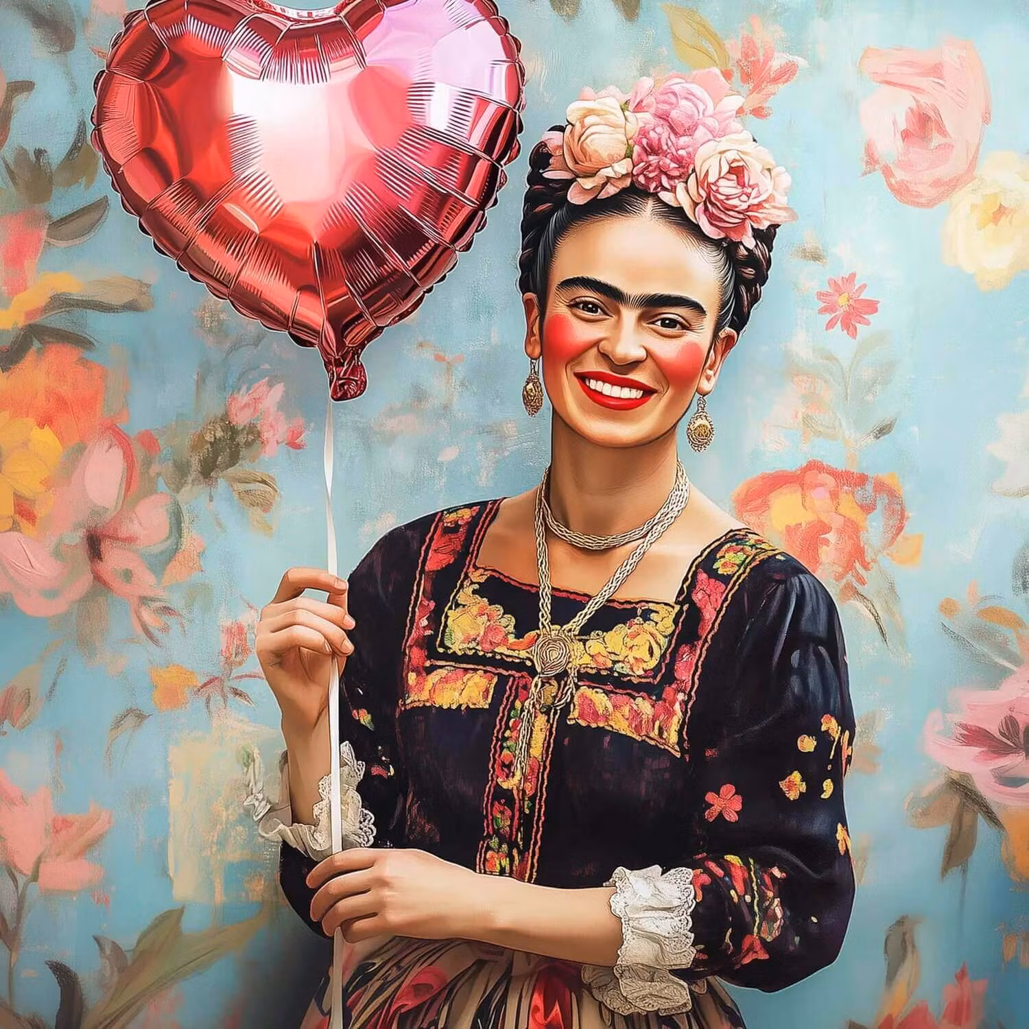 Ett konstnärligt vykort med motiv inspirerat av Frida Kahlo och hennes värld – en uttrycksfull ballong som fångar fantasi, färg och känsla. Det här kortet är lika vackert att skicka med en tanke som att använda som en liten konstnärlig detalj hemma.