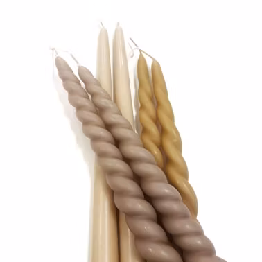 Dekorativa skruvade platta ljus som är färgade ockra. Dessa ljus snurras för hand och är ett riktigt hantverk.