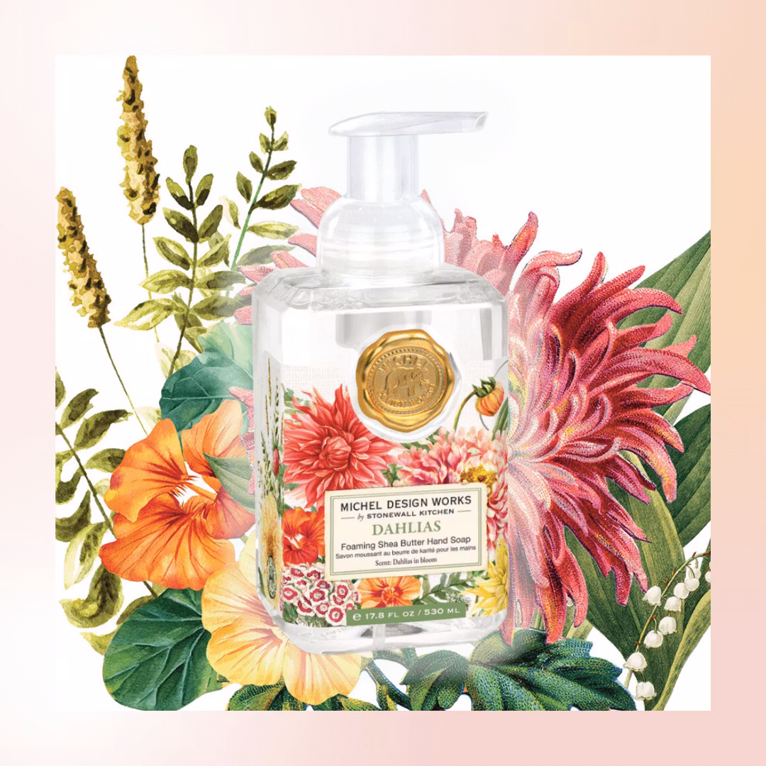 Michel Design Works skumtvål Dahlias är en lyxig handtvål med ett mjukt, krämigt skum och en blommande doft inspirerad av dahlior med inslag av mysk och sandelträ. Doften för tankarna till en lummig trädgård fylld av blommande dahlior där varje pumpning ger en rik, behaglig arom.