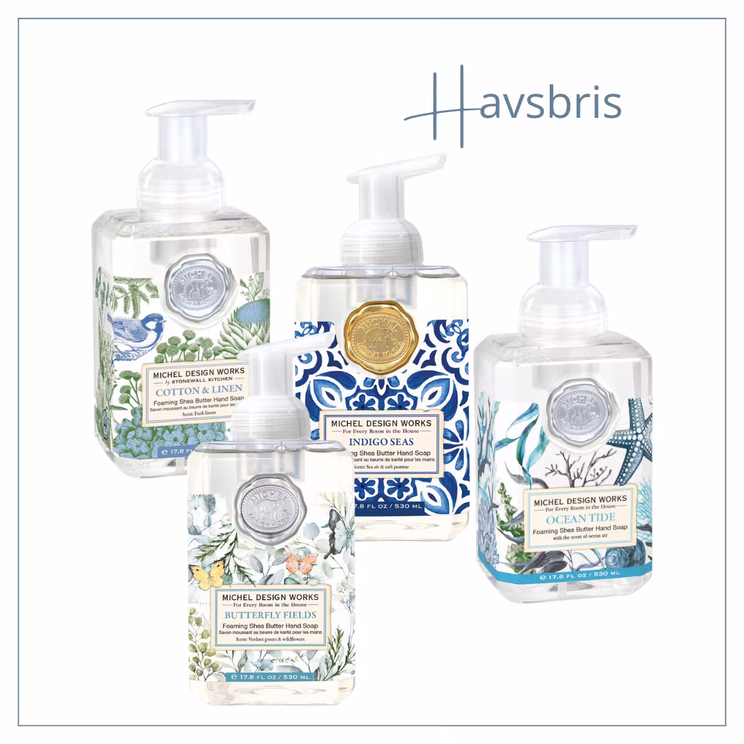 Låt doften av hav, frisk bomull och blommor fylla ditt hem med detta exklusiva 4-pack skummande handtvål från Michel Design Works. En lyxig kollektion med havsnära toner och vårdande formula – perfekt för badrum, kök eller sommarstugan.
