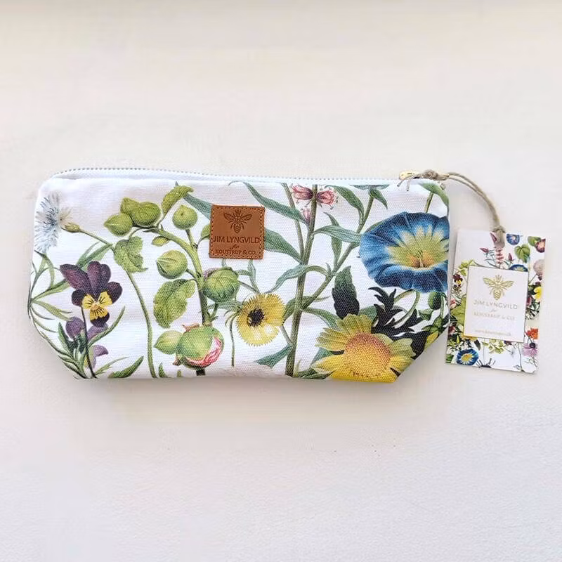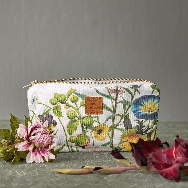 En elegant necessär med vackert blommigt tryck på båda sidor. Insidan är fodrad i en harmonisk grön nyans och pryds av Jim Lyngvilds karakteristiska gula signaturbi. En praktisk och stilfull accessoar som passar lika bra till smink och toalettartiklar som till pennor, penslar eller småsaker i handväskan.