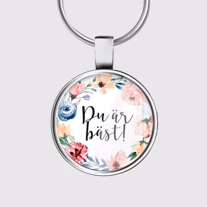 Nyckelring med texten Du är bäst! och en blommig krans runt om. Nyckelringen är tillverkad i rostfritt stål. Fin present, Snabb leverans.
