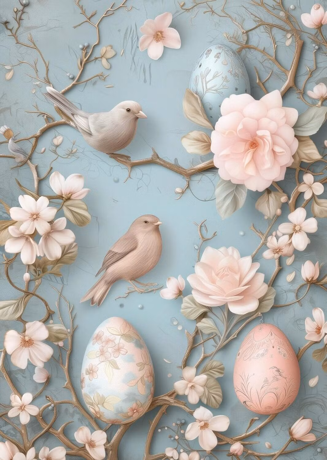 Ett elegant och vårinspirerat påskvykort med vackert motiv som sprider påskstämning. Det här kortet är perfekt att skicka till någon du vill glädja under påskhelgen eller att rama in som en dekorativ detalj i hemmet.