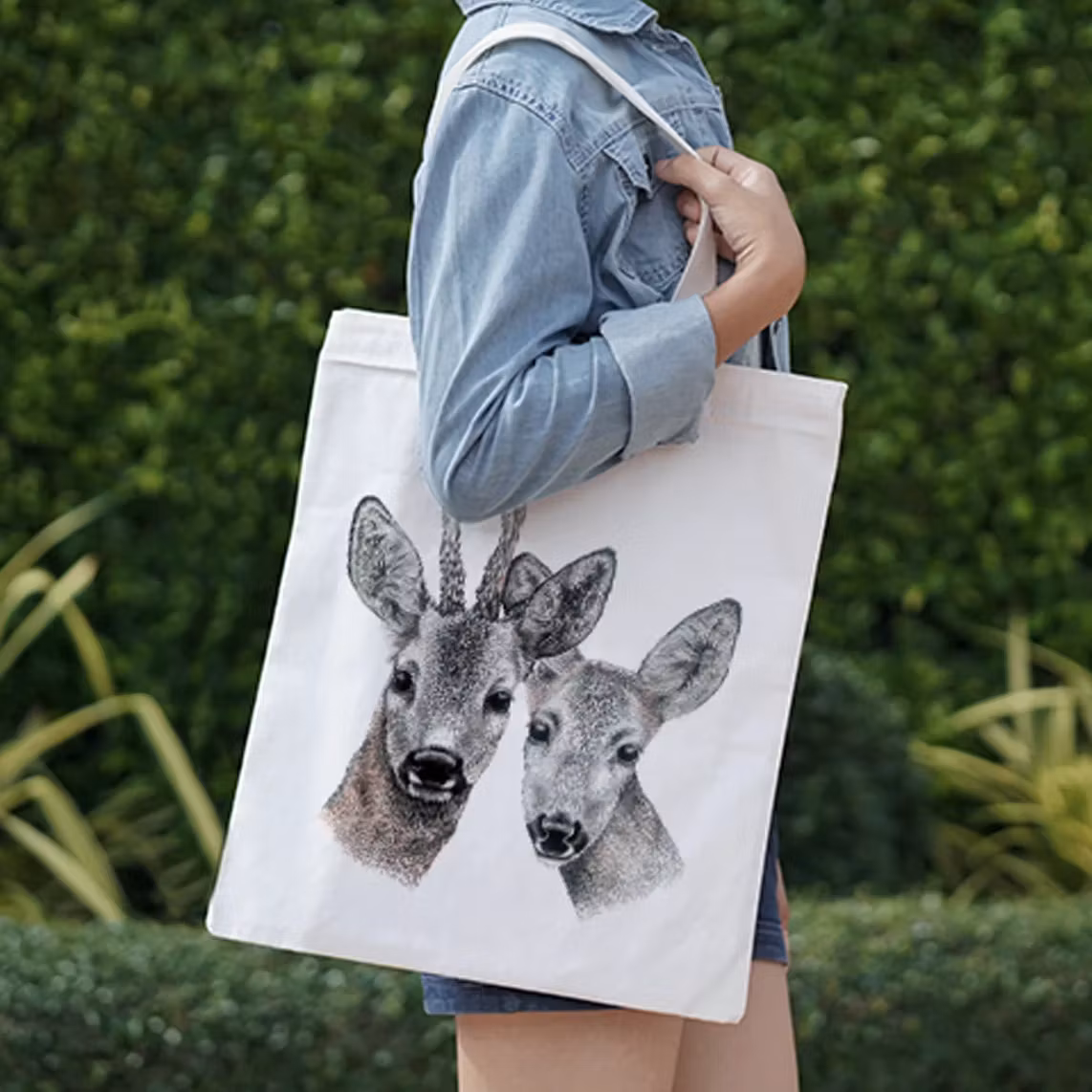 Ekologisk tygkasse i kraftig bomullskanvas med rådjurstryck. Tålig, slitstark och certifierad enligt flera miljöstandarder.