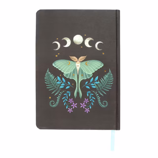Vacker Anteckningsbok med underbart motiv. På det mörka omslaget möts den eteriska månfjärilen, omgiven av frodiga ormbunkar och små blommor, av månen i dess olika faser. Denna design inbjuder till eftertanke och kreativitet under stjärnornas ljus.