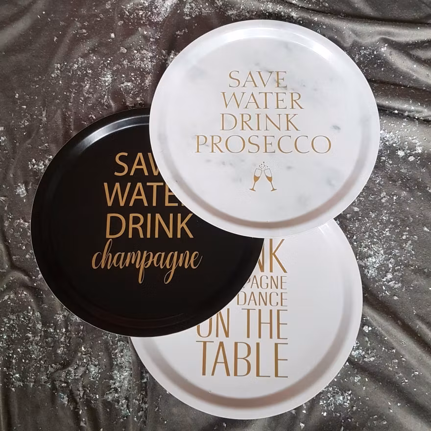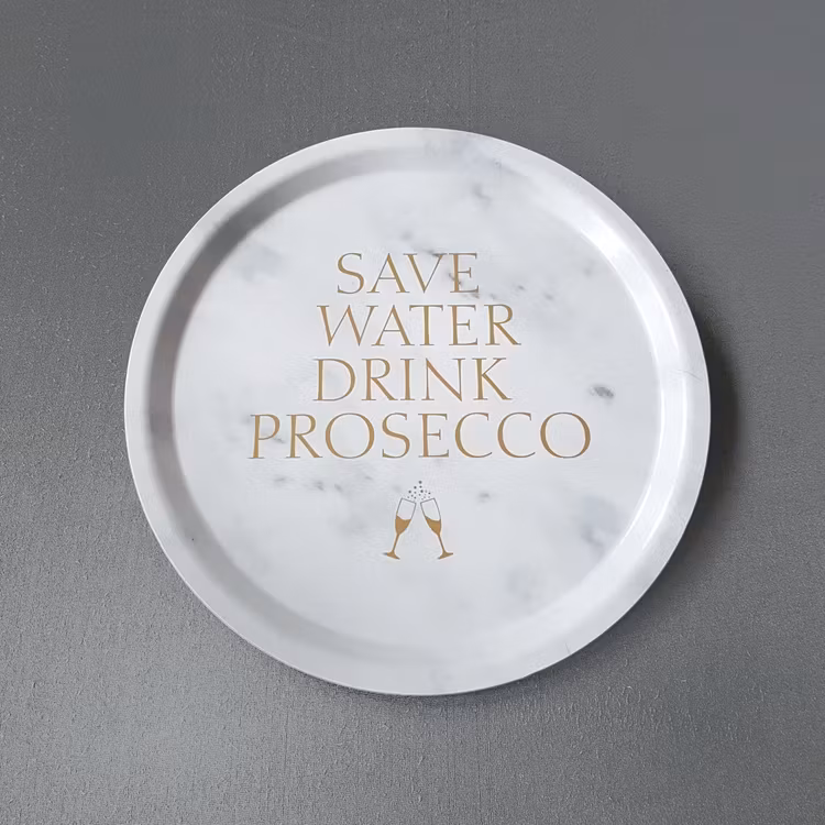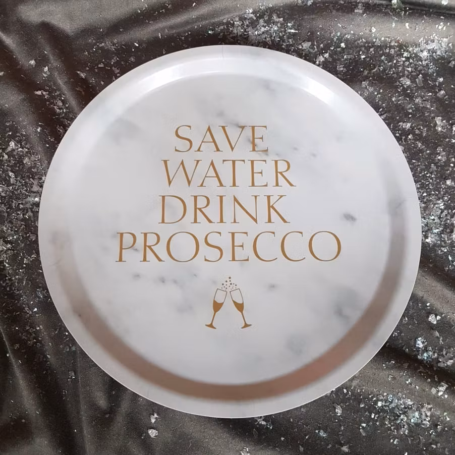 Rund bricka 31 cm. Gråvit  marmor med gyllene text.Save water drink Prosecco.Snygg, lyxig bricka perfekt för nyårsafton eller andra festliga tillfälle