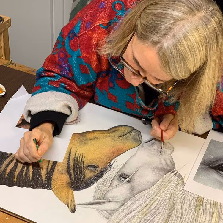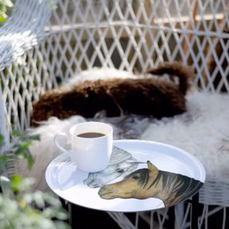 Bricka rund diameter 36 cm med hästar. Fint motiv med mycket humor och värme av konstnären Charlotte Nicolin.Charlotte Nicolin vill vara med och bidra till en b