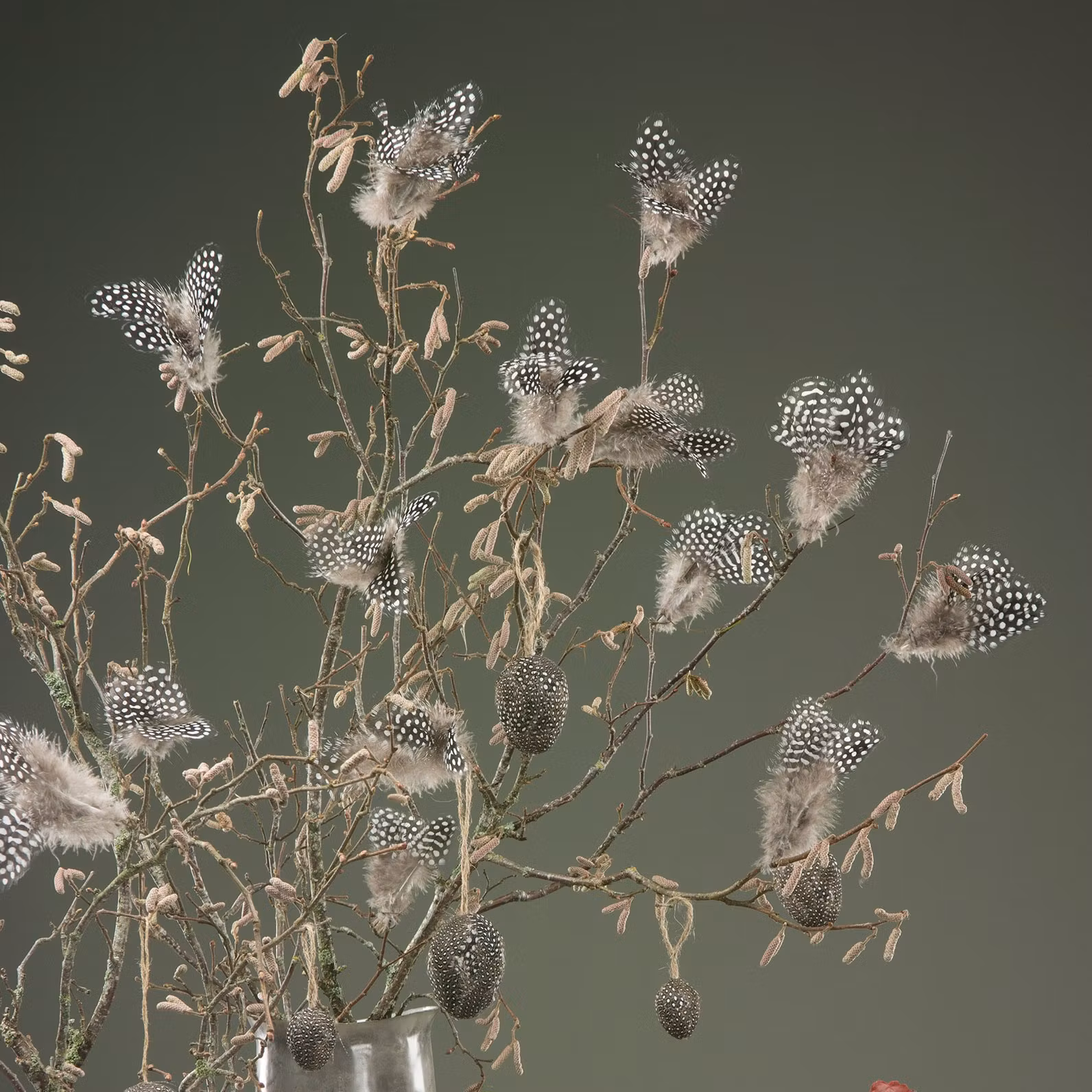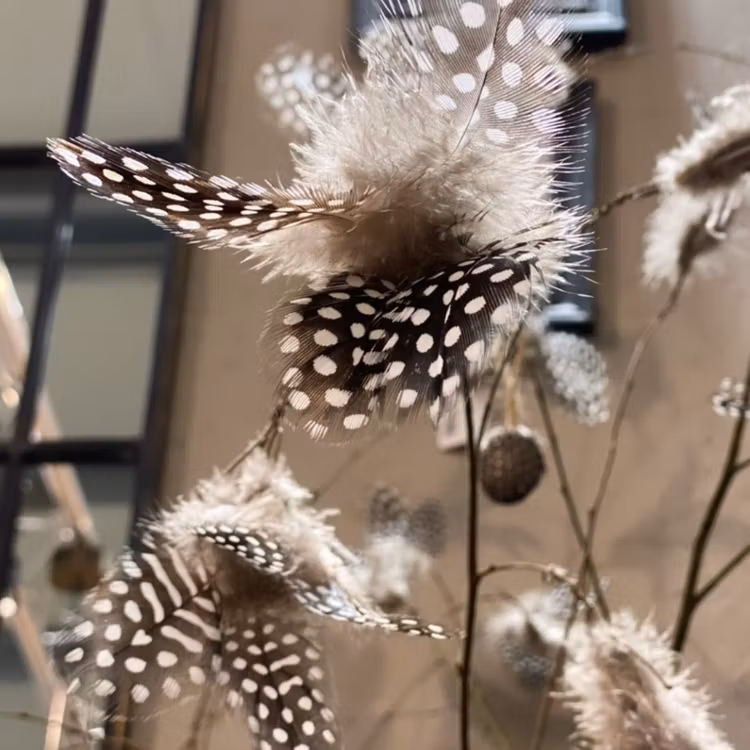 Vackra fjäderblommor för dekoration.Fjäderblomma pärlhöns.Enkla att fästa i björkriset eller på andra sorters kvistar som trollhassel. Fjäderblommorna är ä