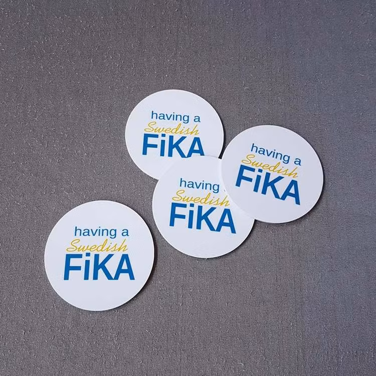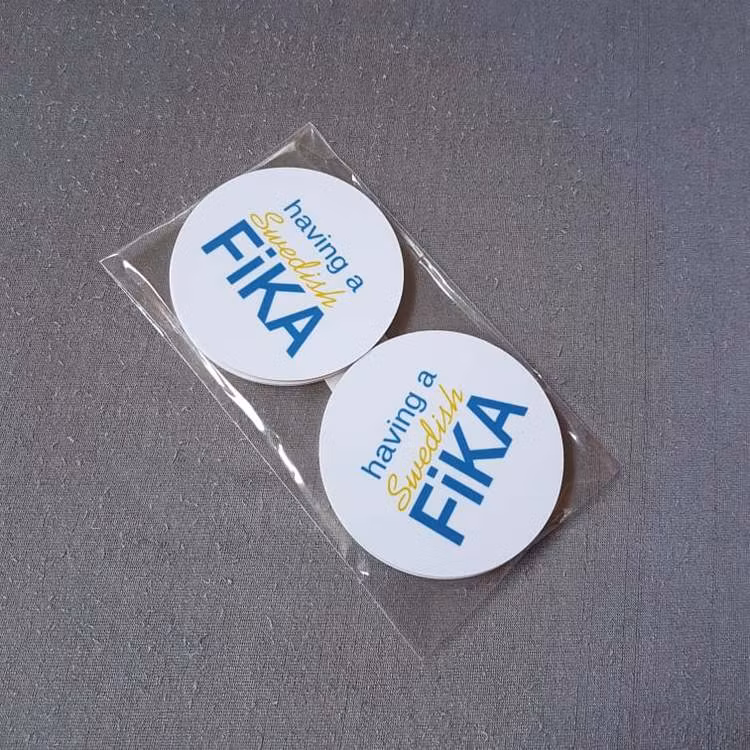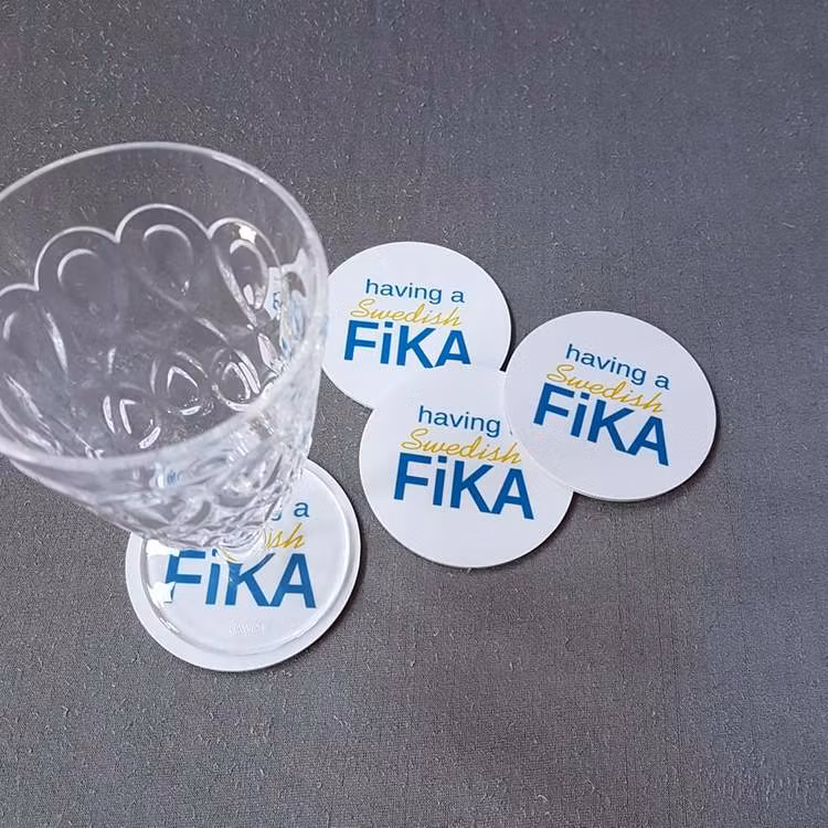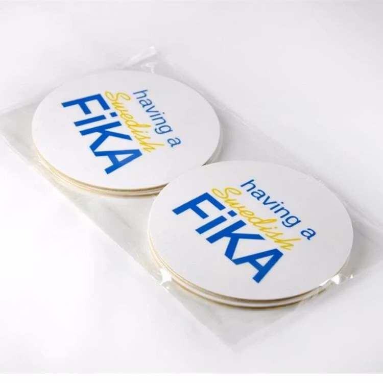 Fina underlägg med texten Having a Swedish fika4 vita med blågul text i en förpackning. Dessa glasunderlägg är fina att ha med när du dukar fram din fika. Det l