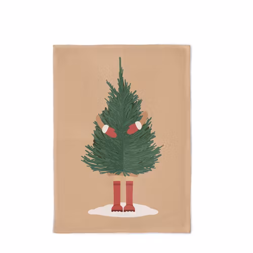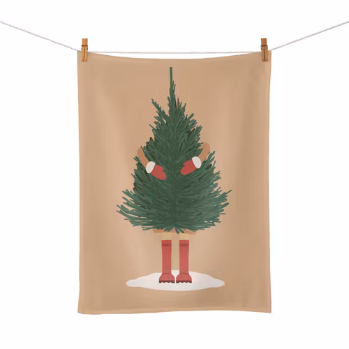 Snygg ekologisk kökshandduk med motiv av julgran som blir omfamnad.