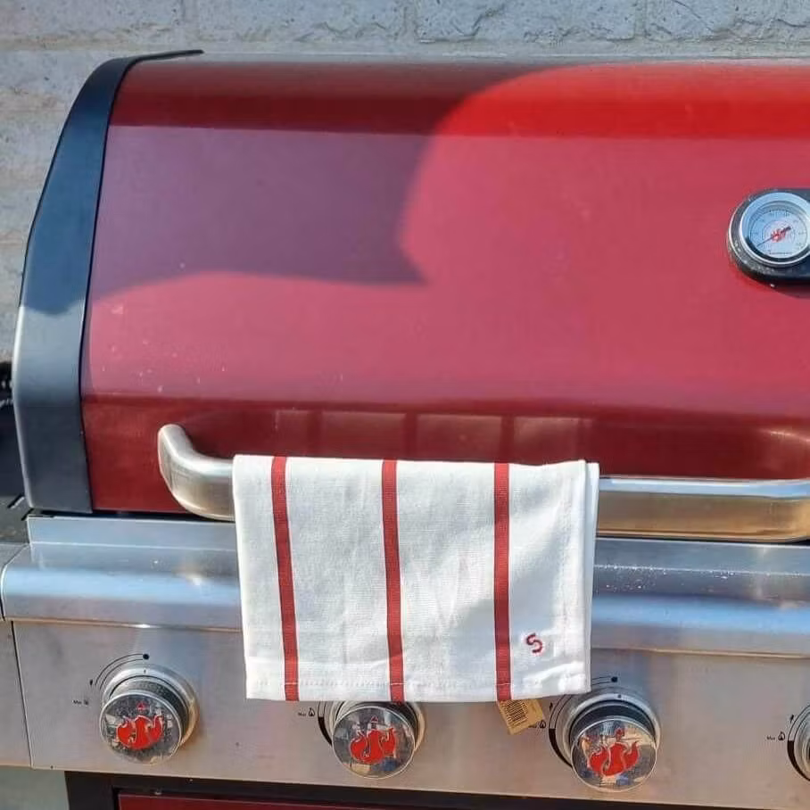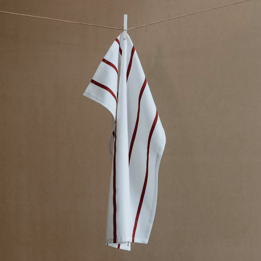 Kökshandduk i randig, vit med röda ränder, tidlös design. En liten detalj i köket som gör stor skillnad. 100% bomull. Maskintvätt 40°.