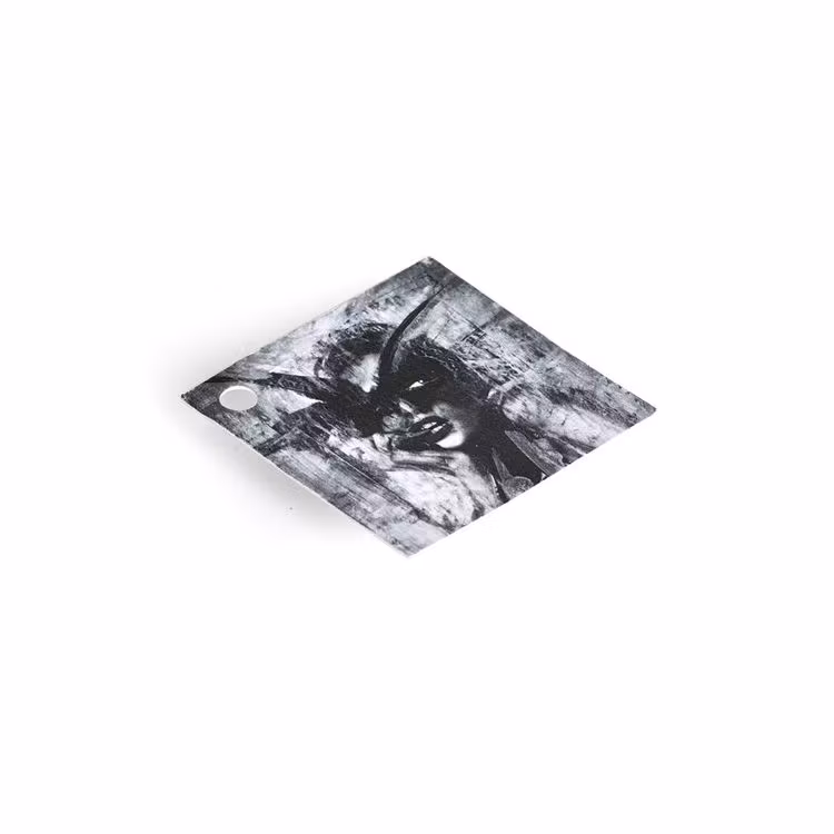 Ett minikort med hål i ena hörnan för att kunna fästa enkelt i paketbandet.