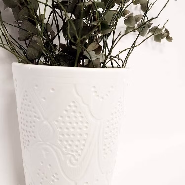 Kruka från Marocko. Vackert mönster som är stansat in i keramiken och sen lämnat "naket" dvs inte fyllt i någon färg.Handgjord och handmålad, därför skiftar fär