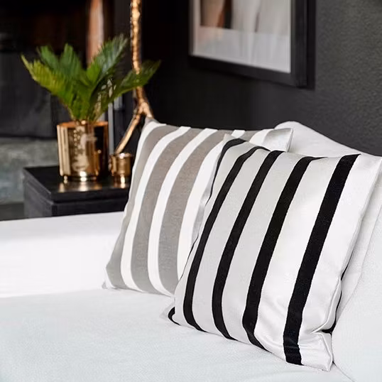 Carolina Gynnings kuddfodral i kollektionen LuxurySnyggt motiv med vita och beige ränder.