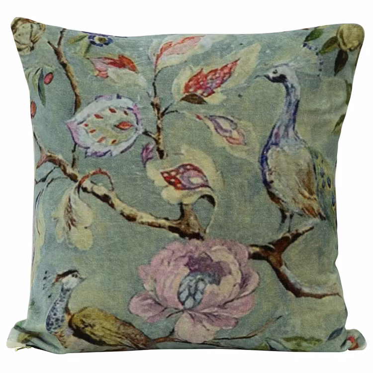 Fantastiskt fint kuddfodral i 100% bomullssammet. Motivet är som en dröm med sina påfåglar och växter mot en mjukt petrolfärgad bakgrund. Ett kuddfodral som ver