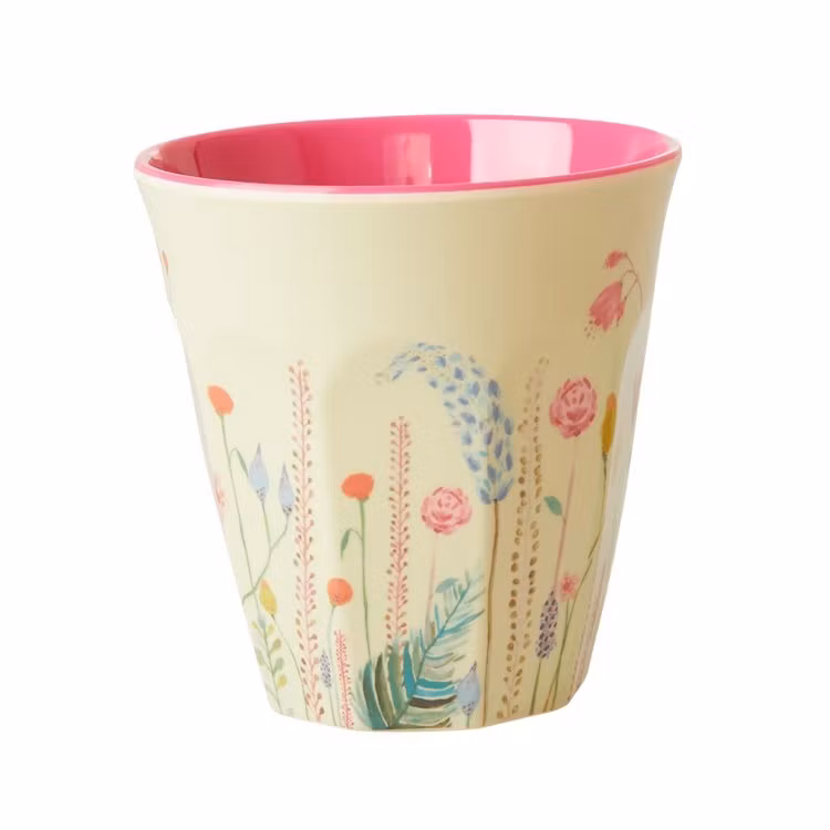 Mugg med mönster av vackra sommar-blommor på en mild grön bakgrund. Muggens insida är rosa.Material:melamin. Rymmer ca 2.5 dl.Mått: 9 x 9 cm. Medium.Godkä