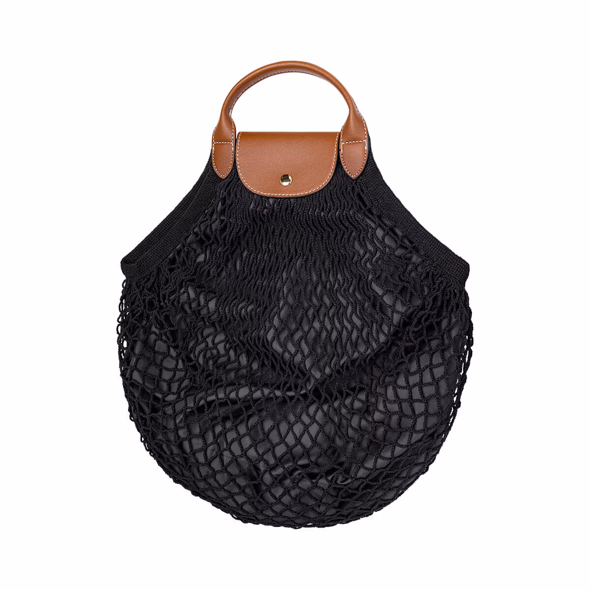 Nätkasse svart. Trendig shopper i svart bomull med nät. Väskan har korta läderliknande handtag eller bär du den över axeln med de långa handtagen i tyg. Snabb l