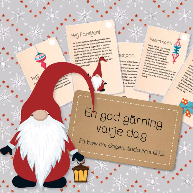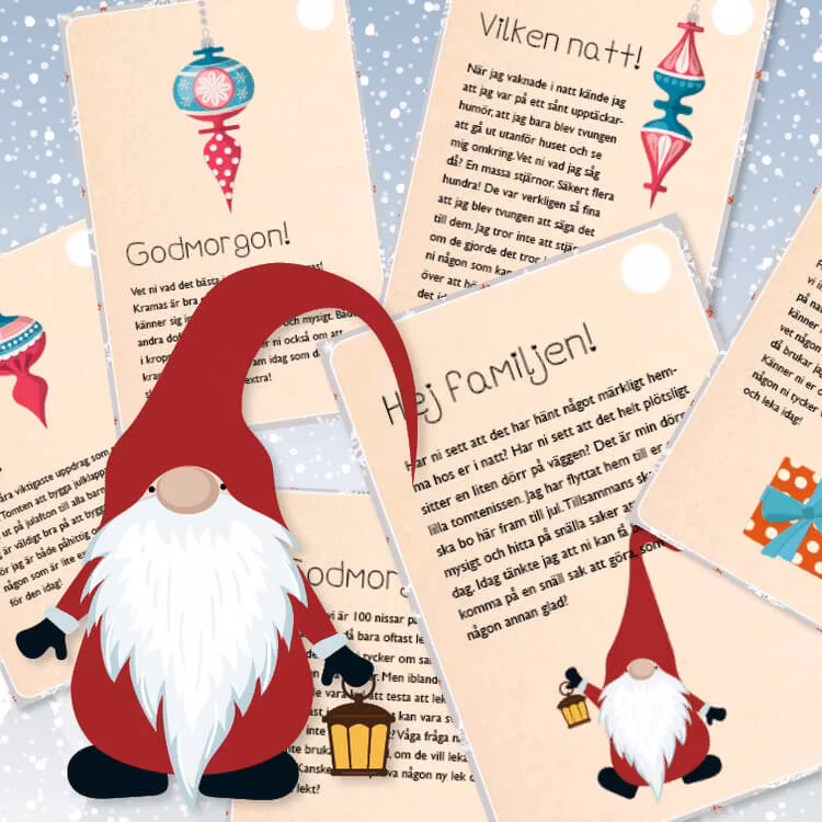 1/12 låter ni en liten magisk tomtenisse "flytta in" hemma hos er familj. Kanske genom att sätta upp en liten dörr på väggen, eller bara genom att placera ut lite julsaker på en väl utvald plats. Likt en julkalender lämnar sen nissen ett brev om dagen hela vägen fram till julafton, då den packar ihop och flyttar hem till Nordpolen igen.