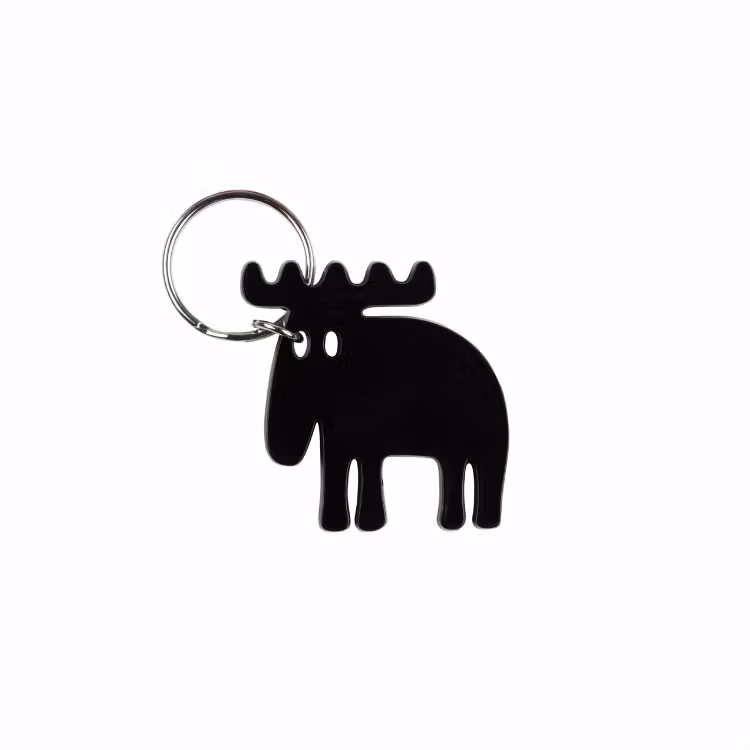 Fin nyckelring formad som en svart älg. Tillverkad av lackerad metall. Älgens höjd 4,5 cm.Design Anders Bylin.