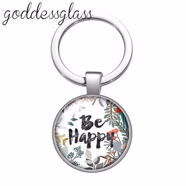 Nyckelring med texten: Be Happy. Svart text på vit bakgrund med gröna blad och färgade blommor/bär. Nyckelringen är tillverkad i rostfritt stål och glas. Snabb