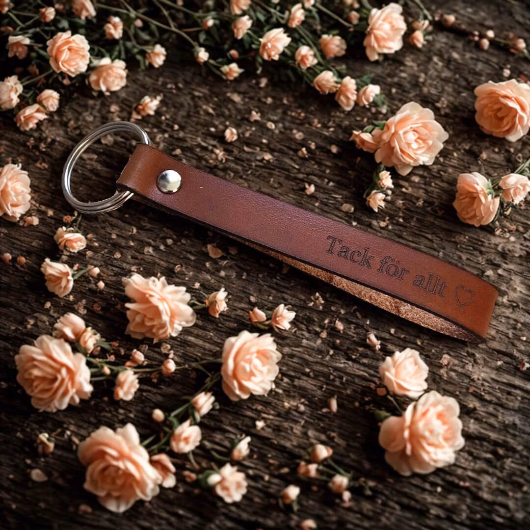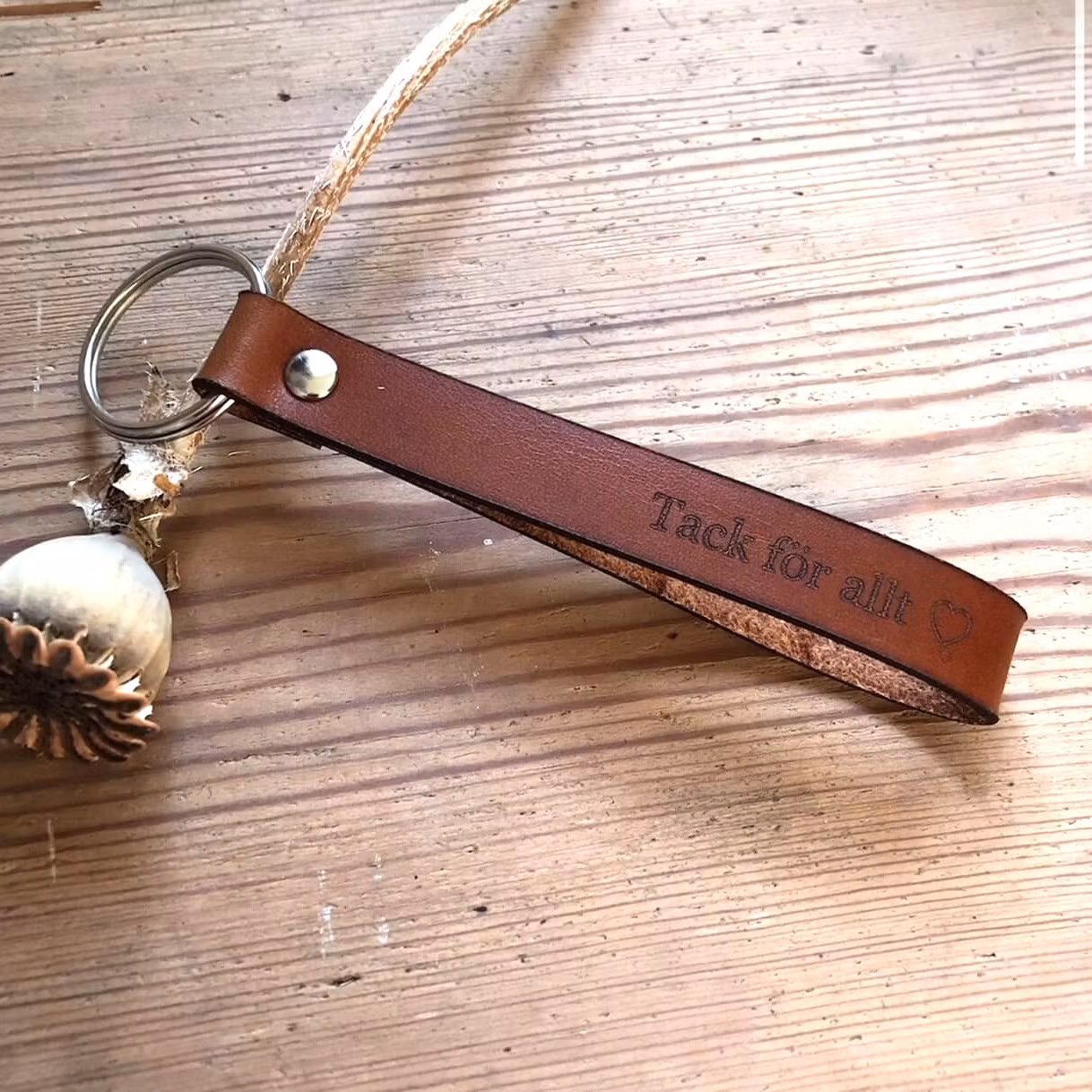 Nyckelring i naturgarvat läder med texten "Tack för allt"