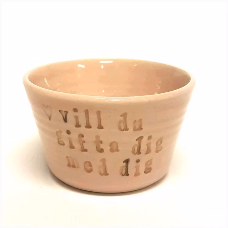 Handgjord skål från ett familjeföretag i Finland. Vilket originellt sätt att fria !!Text: Vill du gifta dig med mig.Färg: vacker blekrosa.Rymmer ca 2 dl. Tål mi