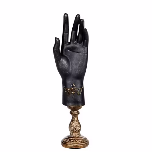Dramatisk svart med en gyllene fot och detaljer på handen. Fin present till den som älskar smycken och lyxiga inredningsdetaljer.