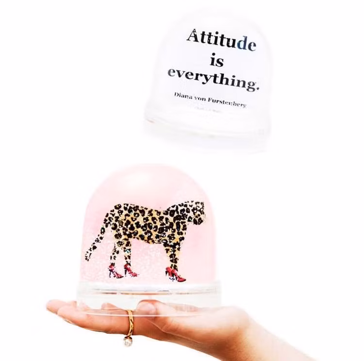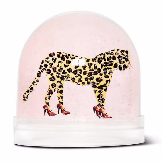 Text: Attitude is everything. Diana von FürstenbergBild: Leopard i högklackat med vita snöflingorShake it Baby är en stor snöglob, brevpress, papperstyngd