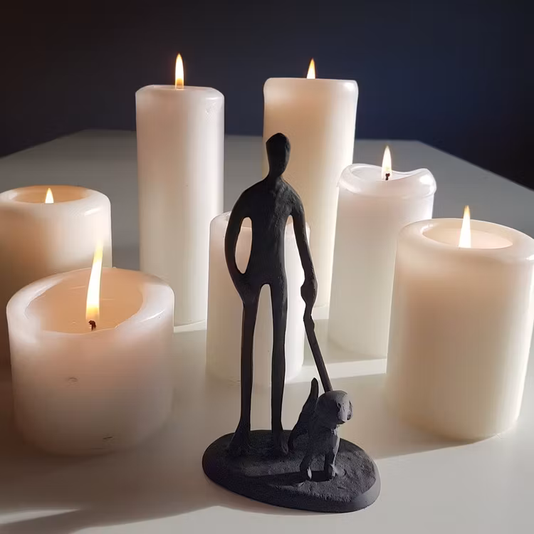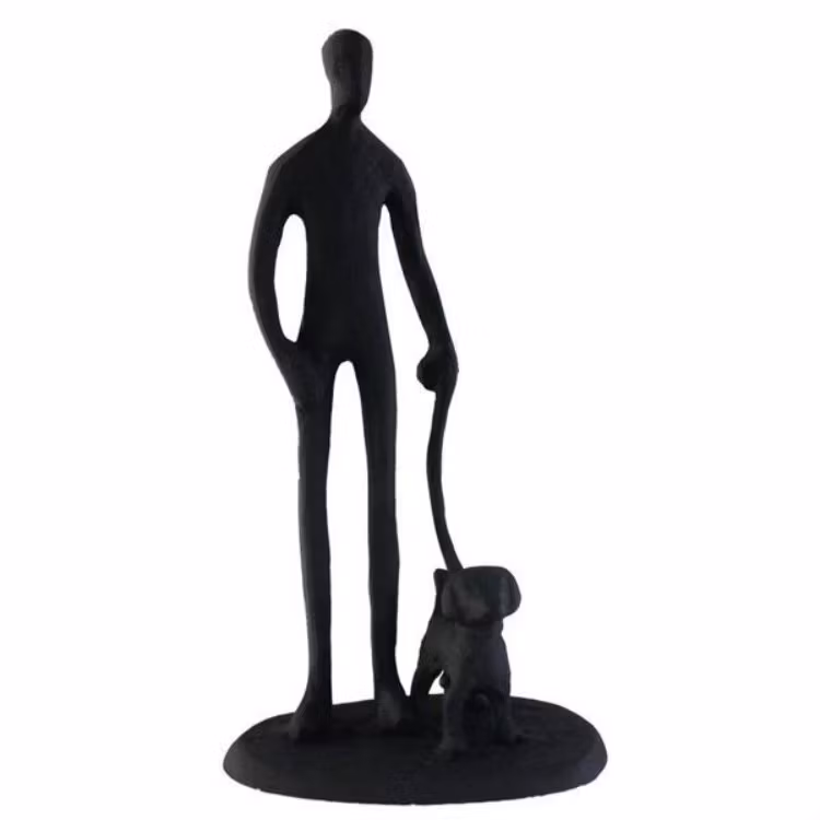 Staty av hund med sin husse,Hundpromenaden, motion, terapi och sällskap. I ur och skur går man ut med sina hundar. Finns inget dåligt väder så länge man har sit