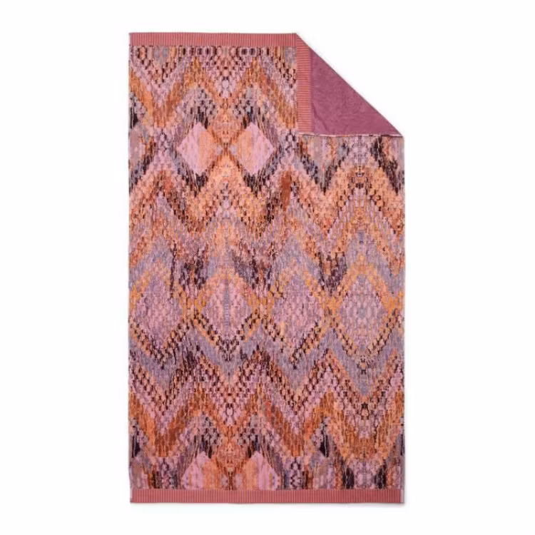 Färgen på denna handduk är en mix av lila, rosa, brunt och orange. Mönstret är unikt och spektakulärt.