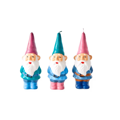 Färgglada trädgårdstomtar, Gnome, av stearin med en veke på toppen i luvan. Fina att sätta i en ljuslykta eller pynta med till advent. Tänk på att tomtarna behö
