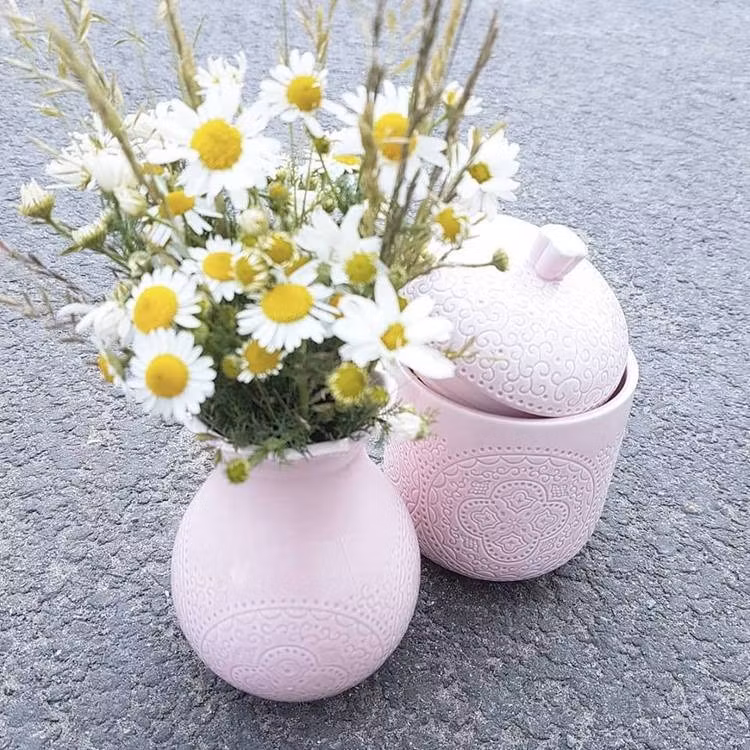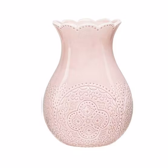 Underbart söt liten vas.Tänk denna med ett gäng nyplockade liljekonvaljer åhhh.......Färg: rosa.Diameter: 9 x 13 cm.För att få fram den vackra mönstereffekten i