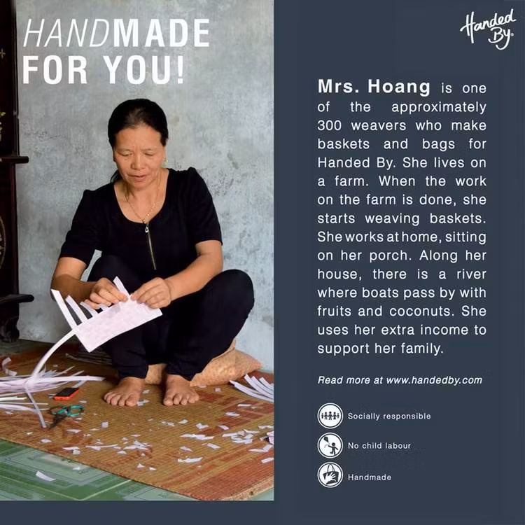 Handed By är ett varumärke från Holland som jobbar med handgjorda vävda väskor. De försöker lämna minsta möjliga fotavtryck på miljön genom att använda bla återvunnen plast. Väskorna är handgjorda och av högsta kvalitet.  Du kan känna dig stolt & trygg när du väljer en väska med den unika stämpeln i form av en hand. Handen symboliserar att alla produkter är handgjorda och fria från barnarbete.